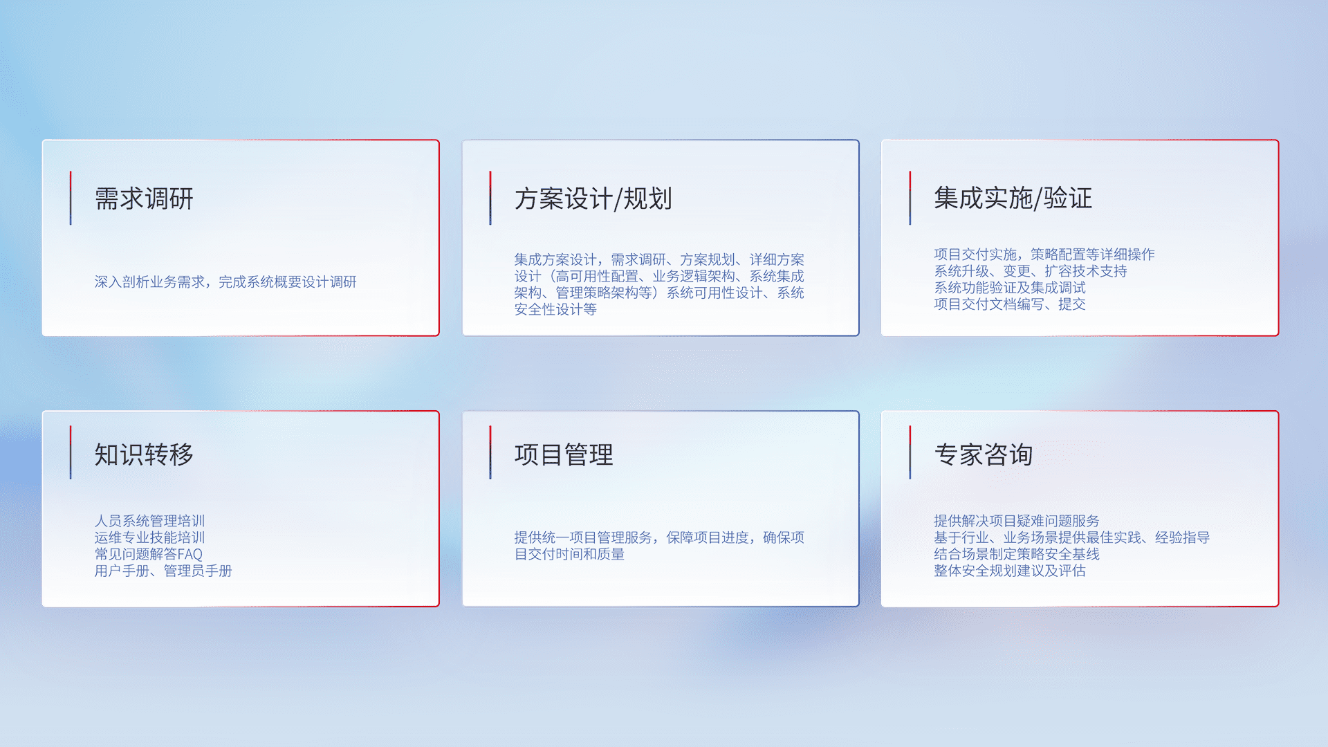 针对客户行业特性,,将宏观的安全战略和需求,,,,通过专业的交付服务,,,实现项目落地,,,为客户提供标准规范的集成交付服务。。。